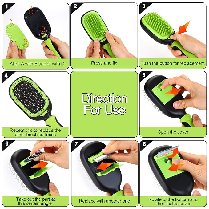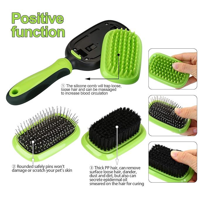 - 5-in-1 Brush Set: This pet brush can be switched among 5 different brush heads: massage brush, tufted brush, knot opening brush, hair removing brush and air cushion brush. You don’t need to use 5 different brushes. The brush can easily remove loose hair, damaged hair, tangles, clumps, dander, dirt and increases blood circulation.