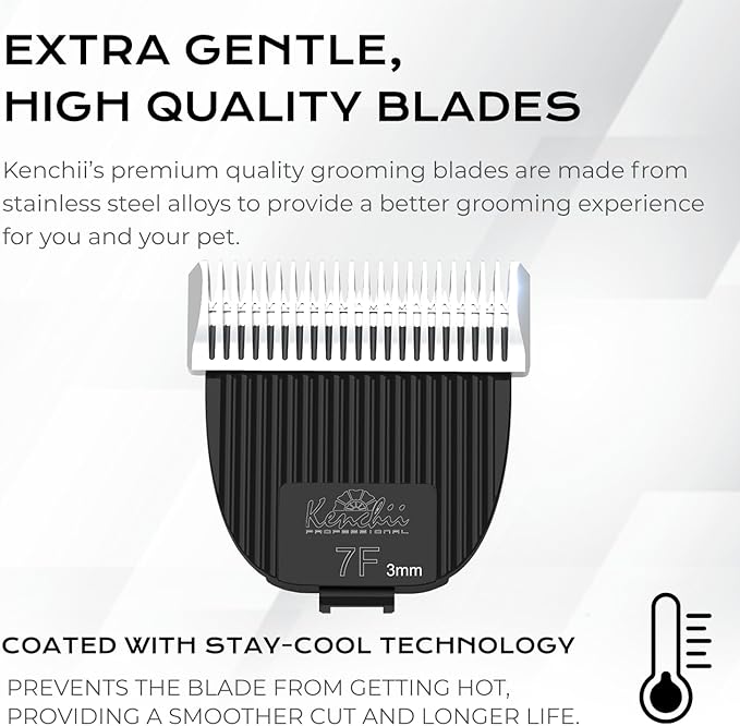- EXTRA GENTLE, HIGH QUALITY BLADES: Kenchii's quality grooming blades feature stay cool technology to make blades run cooler, eliminating overheating. Our proprietary coating prevents corrosion to provide a smoother cut and longer blade life.
