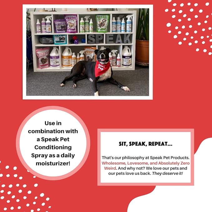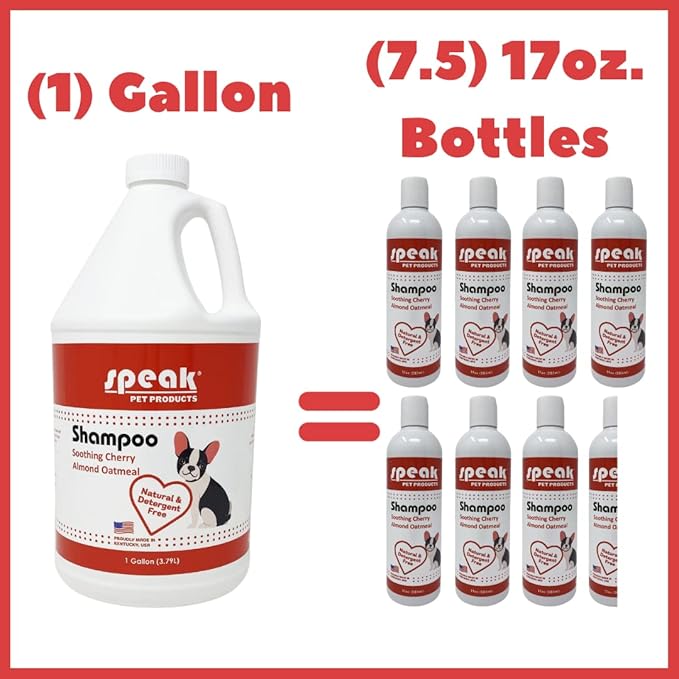 - Contains (1) Gallon of Speak Pet Products Soothing Cherry Almond Oatmeal Shampoo for dogs and 1 pump dispenser