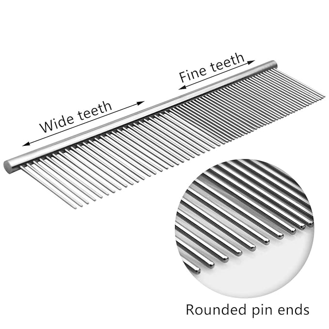 - 【Multi-Function】Our steel combs for dogs can remove tangles, mats, loose hair, besides, massage skin. There are 2 kinds of different spaced rounded teeth, the larger are ideal for tackling tangles, which can efficiently work out matted hair; and the finer can efficiently eliminate loose hair, dander and dirt
