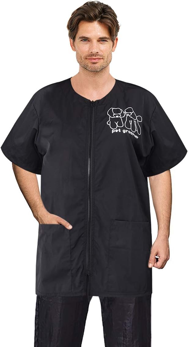 - 【Handy Pocket & Front Zipper】-- Double-sided pocket design, convenient to carry small grooming kit when it is necessarily and it is a professional work clothes for pet workers. This product features round neck with a full zipper which can slip on and off easily.