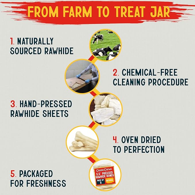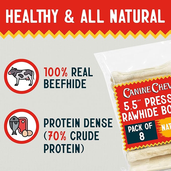 Canine Chews Pressed Rawhide Bones for Large Dogs - 5.5" Long Lasting Dog Chews - Compressed Beefhide Large Dog Chew Bones - Chew Toy Dog Bones - Raw Hide Bones Dog for Aggressive Chewers (5.5", 8pk)