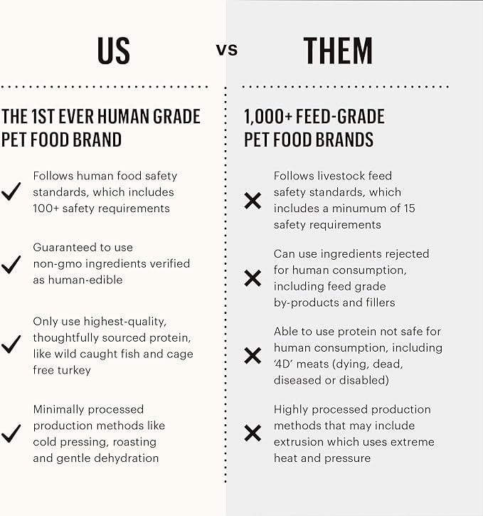 - HUMAN GRADE: Unlike most pet food, which is feed grade, this recipe is 100% human grade – made with human grade ingredients and produced in a human food facility. That means higher quality ingredients and more safety standards, just like you'd expect from your own food.
