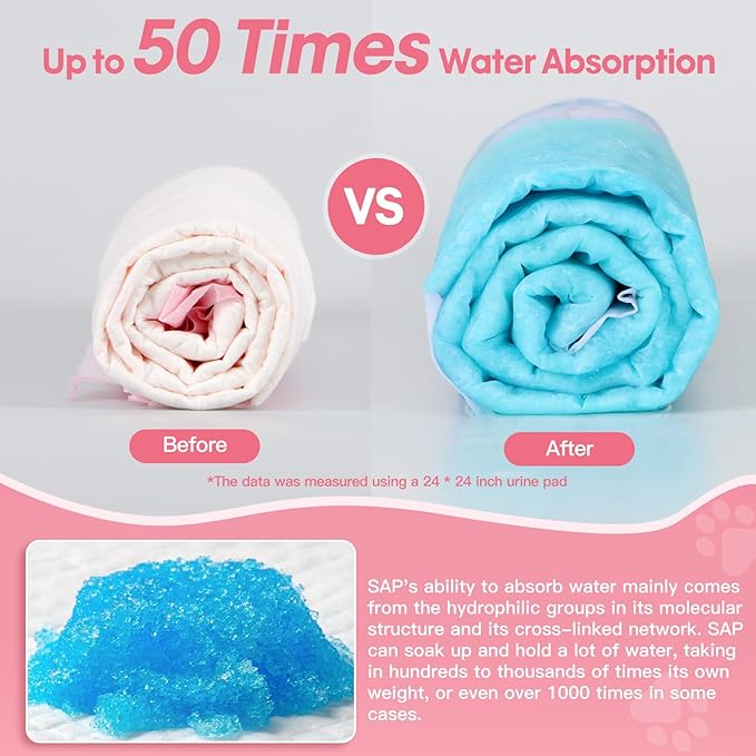 - Easy Training - White soft non-woven fabric, air permeable layer, ultra absorbent polymer, air permeable layer, pink widen leak proof PE .Quick-dry surface with built-in attractant, perfect for training new dogs and making it easier on senior dogs.