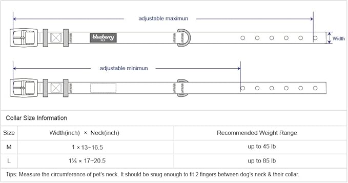 - Neck 13"-16.5", Width 1"; The collar does not stretch itself, please make sure leave ONLY 2 fingers between collar and dog neck. A properly fitting collar and harness won't leave any room for your dog to chew