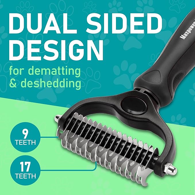 - DUAL-SIDED DESIGN: Our grooming brush is perfect for dematting and deshedding your pet's coat! With a dual-sided design, use the 9-teeth side to tackle stubborn mats and tangles and the 17-teeth side to thin out and deshed your pet's fur.