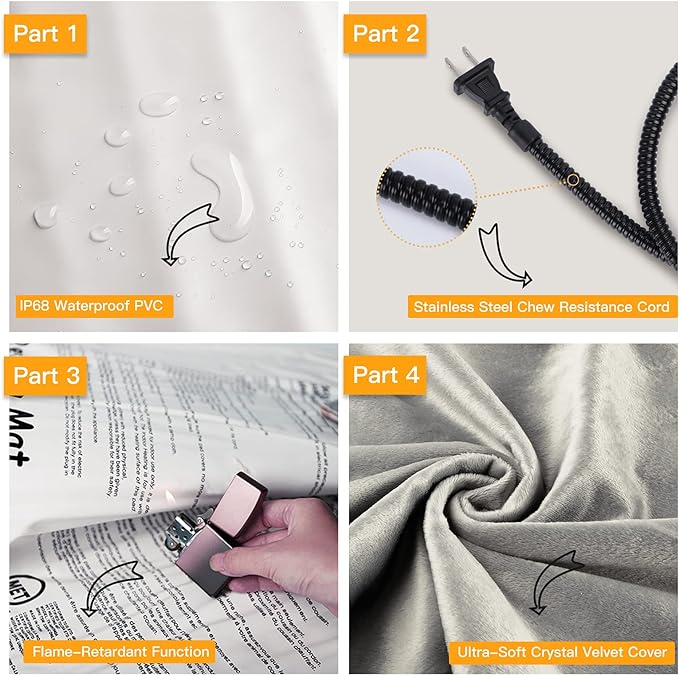 - ❤[Safe and Reliable Construction] The pet heating pad features a machine washable outer cover for easy cleaning, while the inner pad can be wiped with a damp cloth. With 7 layers of protection and UL-recognized heating wire, it prevents pets from getting burned. The soft PVC shell is waterproof and flame retardant. The heating pad has a built-in smart temperature sensor to prevent overheating and ensure pet safety. Do not let your pet lie on the pet heating pad without a plush cover!