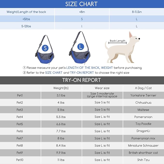 - Product Details: The small size of Nobleza pet sling carrier is 12.2×9.5×8.7 inches (L* W* H), recommended for pets within 10 lbs, such as Chihuahua and Papillon, Pomeranian, Bichon, Teddy, Yorkshire terrier, etc. Please measure your pet's weight and size before purchasing. Please refer to our second picture (MEASUREMENT METHOD & SIZE CHART).