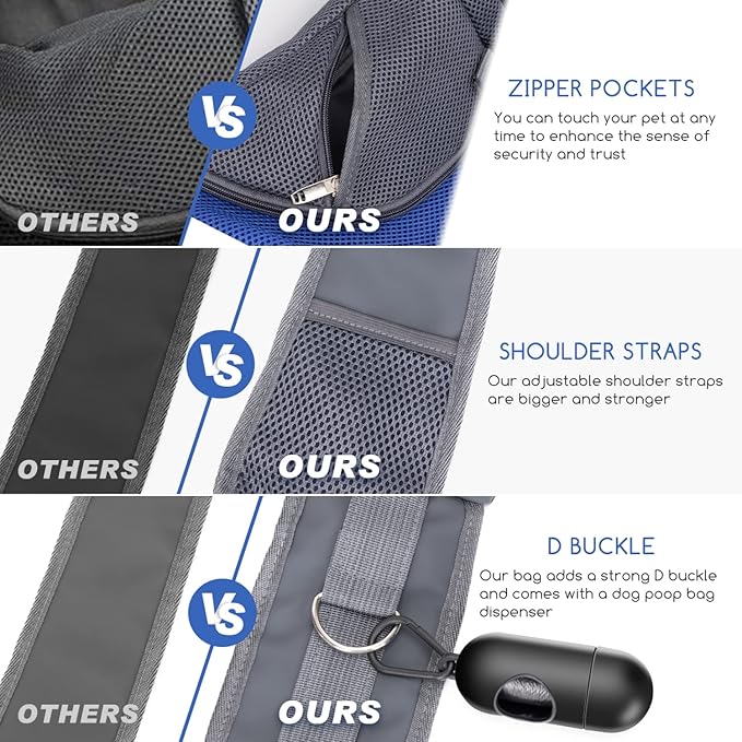 - User-Friendly Design: Designed with a zipper-style pocket, Nobleza puppy carrier sling allows you to reach into and caress your pet, which could enhance your pet's sense of security. At the same time, we can use this pocket to adjust the pet's arms and legs and body sitting posture, which can make you and the pet more comfortable and safe.