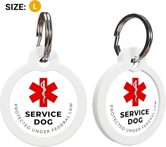 - ALL-IN-ONE Service Dog ID tag is presented with Red Medical Alert Symbol on the front and QR code on the back. We offer this Service and ESA dog ID tags in two sizes for small and large dogs.