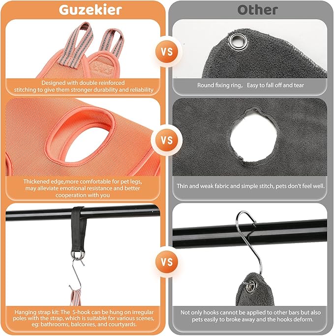 - 🐕 [ Professional Dog Grooming Kit ]: Nail clipper x 1(safety stop guard design), Nail file x 1, Pet comb x 1 (rounded ends stainless steel teeth), Premium quality S-hook x 4 (suitable for the round bar), Hanging Sling x 2(suitable for the irregular bar )