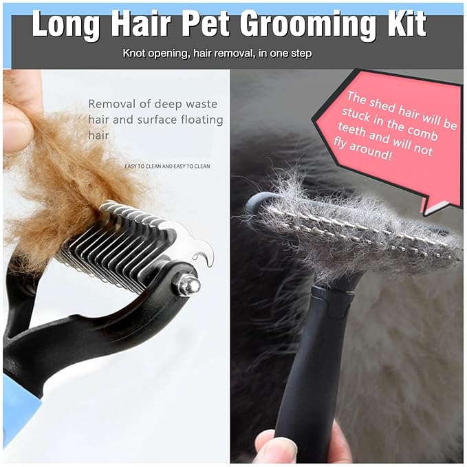 - 【2-in-1 Grooming Set Pet Rake Comb + Dematting Comb】- If you don't like to cut your pet's hair and like maximum fluffiness in their coat, the Tsurepaw Pet Grooming Set can help you! Gentle grooming set includes a double-row rake comb and a double-sided knot-opening brush. Ideal for opening tangles and grooming the fluffy coats of medium to large dogs and cats.