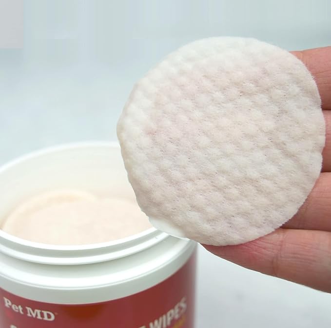 - Pet MD topical wipes are great for cleaning between baths, and for getting between folds and skin..