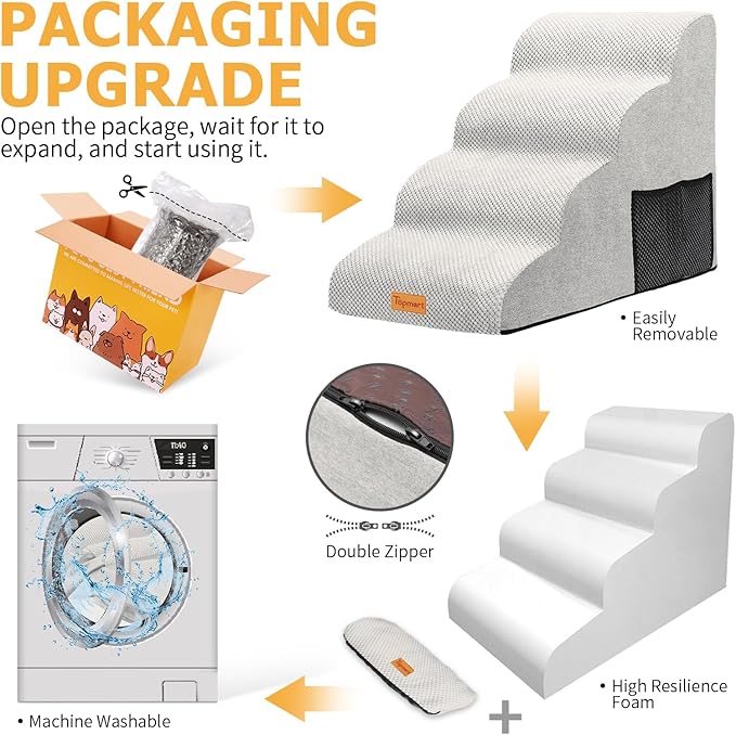 - Waterproof, Washable Cover: The surface of the cover is made of corduroy, the bottom of the dog paw pattern made of silicone, the sides and back are made of suede, all-round to achieve the effect of non-slip. Cover added waterproof layer to protect the sponge from getting dirty. Even if the pet accidentally pee on the dog ladder, will not leave a mark on the sponge. Only need to clean the cover can be. Cover can be machine washed.