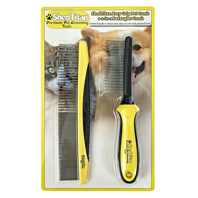 - Dual Pet Grooming Tool Set - Dog and cat grooming supplies, rated 5 barks out of 5! 2 paws way up! Bundle includes a 2-in-1 detangler plus an easy-grip metal comb with coarse and fine teeth. Perfect as a dematting comb for dogs or deshedding tool for cats.
