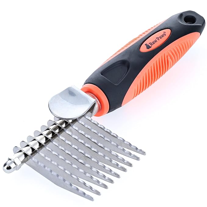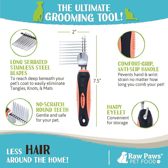- ULTIMATE DEMATTING RAKE: Raw Paws dematting comb for dogs and cats is ideal for cutting through mats, tangles and knots while removing loose hair, trapped dirt and dander! The long blades on our dog undercoat rake helps to significantly reduce shedding by allowing you to easily reach the undercoat on your pet.