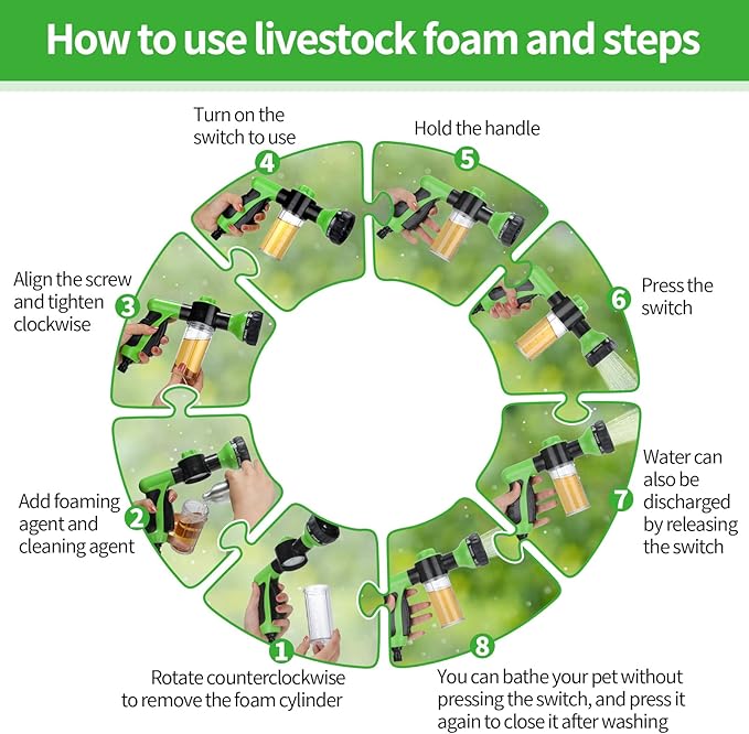 - Using method: wash your pets in five minute to gain a better cleaning effects; Just put desired foam shampoo to the container bottle, spray the foam on pets' body, give them a comfy massage, then rinse the foam off; For obtaining a better cleaning effect, please do not pre-wet your pets before using, because pre-wetting will interfere with the performance and reduce the shampoo's effectiveness; This pet bathing tool is suitable for most kinds of pets