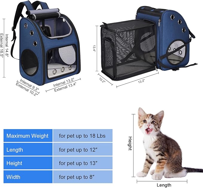 - MEASURE YOUR PET BEFORE PURCHASEING: Its external size is 13.4"L x 10.2"W x 16.5"H while the internal size is 13.0"L x 9.3"W x 14.8"H and can be 13.0"L x 25.3"Wx 14.8"H after fully expanded. Recommended max load is 18 lbs. Do not select the backpack size based on weight only, please reference your pet's length(front feet to base of tail) and height(floor to top of head) in selecting a backpack size. Note: Each airline sets their own specific requirements, so it is advised to check with your airline of choice.