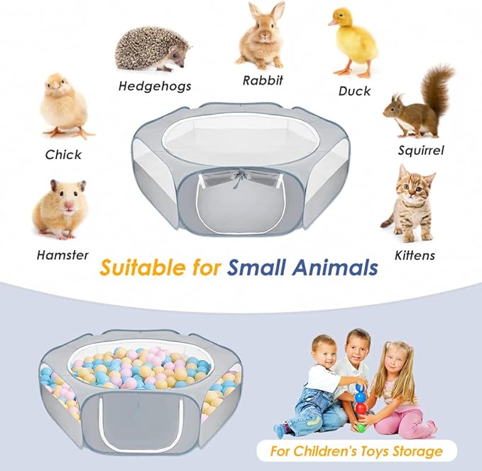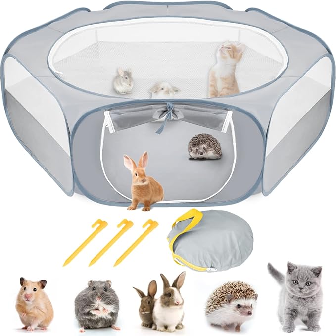 SlowTon Small Animal Playpen Portable - Durable Cat Playpen with Reinforced Mesh, Foldable Pet Playpen Exercise Play Pen with Zipper Top Cover Puppy Fence Kitten Rabbit Ferret Chinchilla (M,Grey)