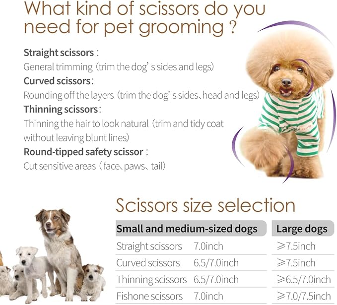 - 🐶[100% Satisfaction] Each pair of dog trimming scissors for grooming , we go through more than 10 inspection processes to ensure that you get the more satisfactory scissors. If you have any question, please contact us. We offer 100% satisfaction or money back. Invest with no risk.