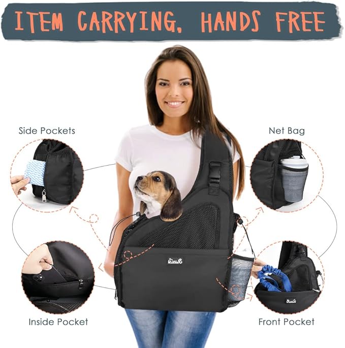 Lukovee Dog Slings for Small Dogs, Hard Bottom Support & Adjustable Soft Padded Shoudler Strap Dog Sling Carrier, Dog Purse with Button Closure & Zipper Pockets (for Pets 6-12 lbs, Black)