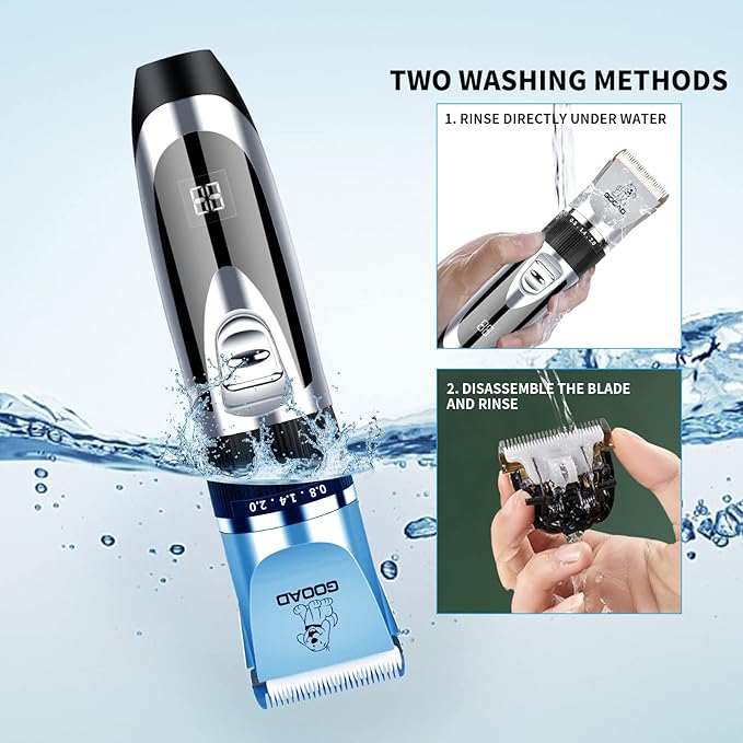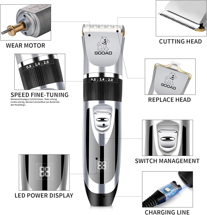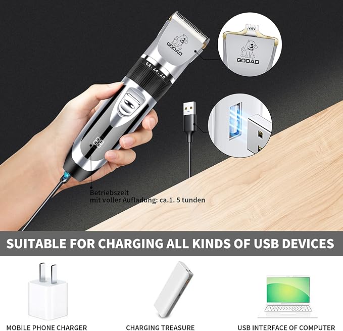 - Long Lasting Battery & LED Indication: USB charging design .2200mA High Capacity Li-ion Battery, charging for 3 hours and can sustain use of 250 minutes.With LCD display,for reminding using and charging status,helping you better control the grooming work.Rechargeable design of this dog clipper, you don't have to buy replace batteries. Long-term use does not cause wrist pressure or pain
