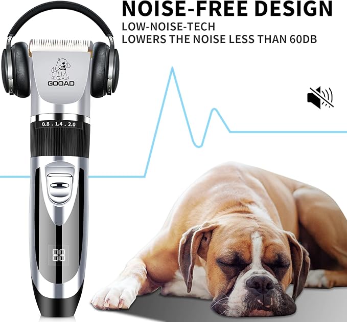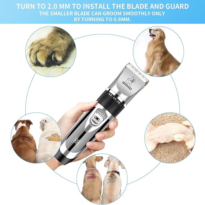 - Low Noise & Strong Power: Q-SUS Low-Noise-Tech lowers the noise less than 60db. Adopt silver Pd-alloy 3 speed motor, heavy-duty and durable. 5 Size Fine Tuning Knob,Dog clipper has 0.8mm-2.0mm Fine Tuning Knob, which allow you to adjust different hair lengths for versatility. This High Performance dog grooming kit help you get the suitable length for the pet coat.