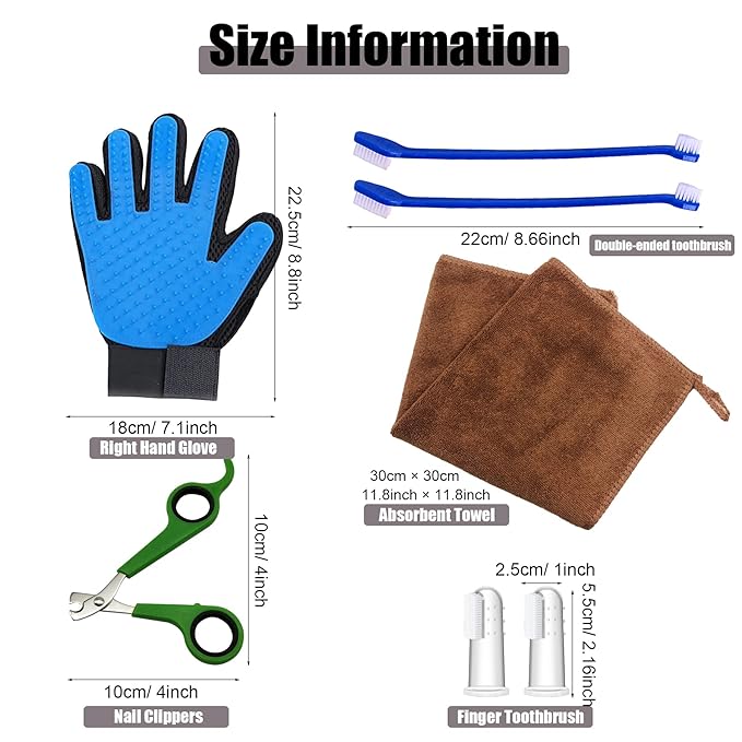 - Package includes: 1 x long needle hair grooming brush, 2 x silicone massage brush, 2 x double-sided comb, 1 x long flea comb, 2 x finger toothbrush, 1 x nail clippers, 2 x double-ended toothbrush, 1 x right glove removal brush, 1 x cleaning cloth.