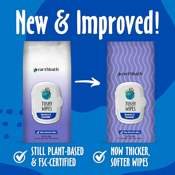 earthbath, Rosemary & Chamomile Tushy Wipes - Dog Wipes for Paws and Butt, Pet Wipes for Dogs & Cats, Made in USA, Cruelty-Free Dog Cleaning Wipes, Helps Neutralize Odors - 100 Count (1 Pack)