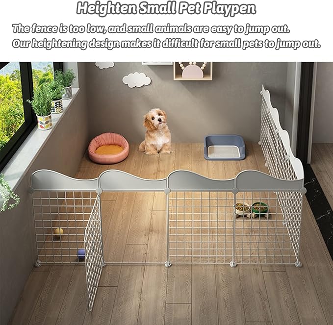 - 【Raised Fence】: The raised fence of rabbit playpen with door can effectively prevent pets from climbing and escaping. The grid panel allows you to observe the status of pets in the fence from multiple angles. Even if you are busy, you can make them play happily.