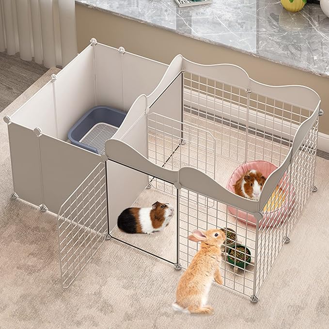 - 【Safe Pet Play Space】: Guinea pig playpen is made of plastic and iron, composed of 14 panels, and a spacious pet playpen, allowing your little pets to play comfortably. Package content 14 x fence and anti-escape panel, 1 x wooden hammer, 26 x connector and 1 bundle of cable ties.