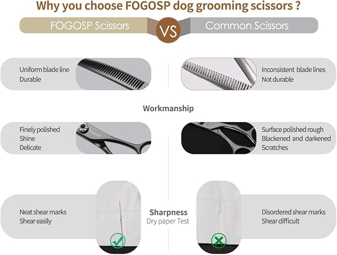 - 🐶[Multipurpose Dog Grooming Shears] FOGOSP curved chunker shears is designed for the trimming,thinning,styling and shaping. It is easy and fast to thinning your pet hair, and it easier to use when styling and shaping towards the end of the groom. They leave a smoother and fluffy outline, and save time versus trying to achieve curves only using straight scissors or curved scissors . It will exceed your expectation to create pretty and sophisticated pet hair style.