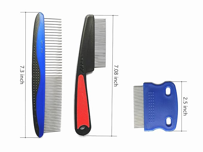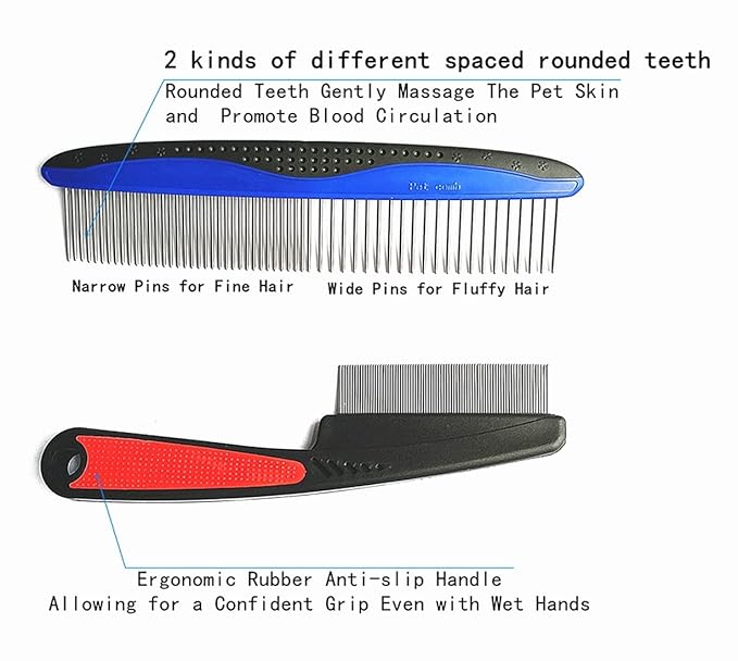 - Dog Combs: Our comb length 7.3 inches,Anti- static Rubber handle prevents slippery accidents to keep you & your pet safe.2 In 1 design, wide teeth for fluffy hair and narrow teeth for fine hair.Ideal for breaking up tangles and removing loose hairs, dander and dirt trapped beneath the fur.