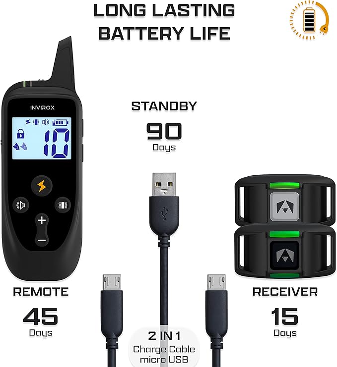 - 24/7 Customer Service & 1-Year Warranty: Rechargeable dog training collar with remote- lasts up to 45 days & the Receiver collar with up to 15 days operation per single charge