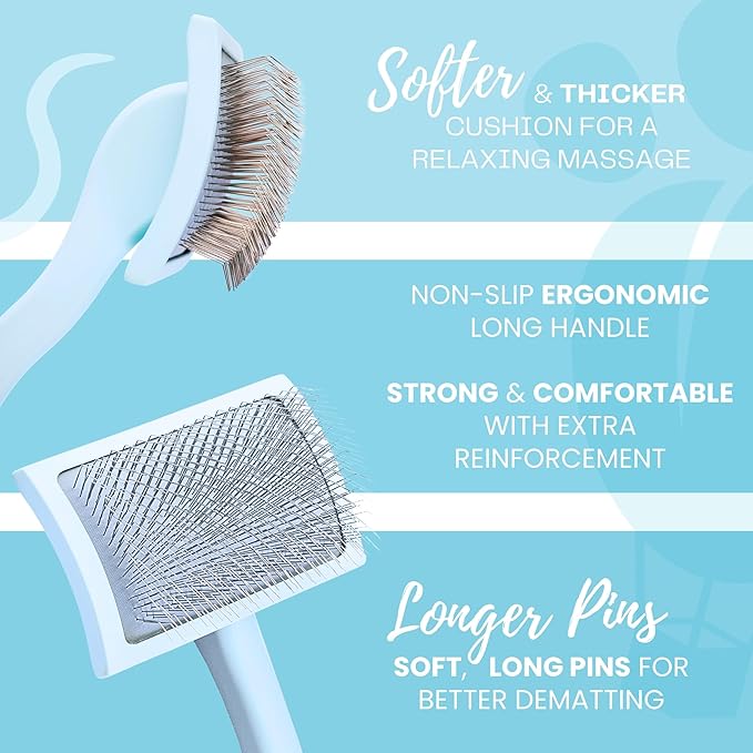 - CALMING MASSAGE EXPERIENCE - Designed with 50% longer and softer pins than a standard slicker brush for dogs and cats, our pet brush glides through thick coats without tugging or pulling hair, or scratching their skin, for a relaxing massage.