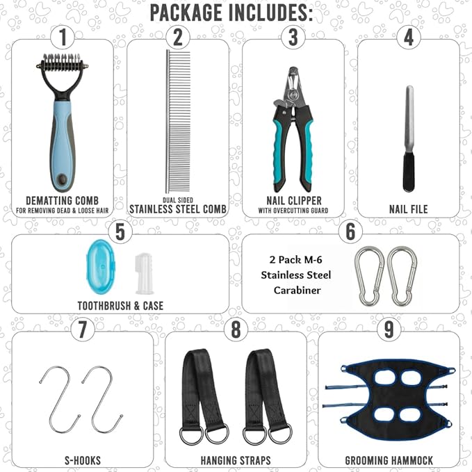 - 6 Piece Grooming Bundle: This all in one grooming bundle includes everything you need to get started grooming your pet at home; Our kit includes one pet hammock with a dematting comb, stainless steel comb, nail clipper, nail file, finger brush for brushing teeth, and 4 carabiners, 2 S hooks, and 2 hammock hanging straps