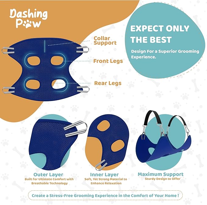 - A COMFORTABLE, RELAXING HOLD without compromising durability – The Dashing Paw dog hanging harness for nail trimming is crafted with a BREATHABLE outer layer & a SOFT YET STRONG inner material to ENCOURAGE RELAXATION. Our durable dog lift harness is RUGGEDLY CONSTRUCTED to withstand use after use to make at-home grooming a breeze for you & your dog.