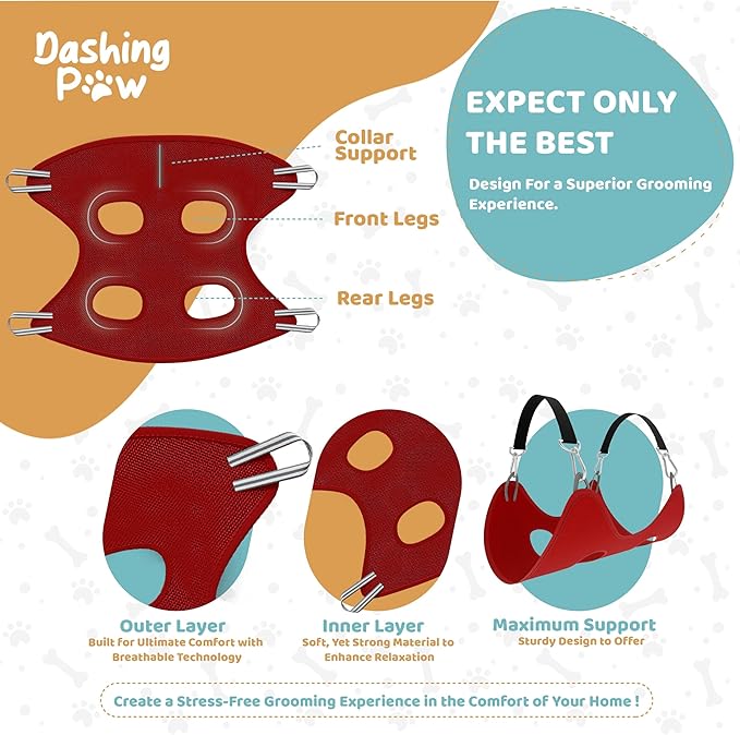 - THE LAST THING YOU NEED IS A FLIMSY DOG SLING with weak, unsecured S hooks that put your best fur-friend at RISK OF FALLING. At Dashing Paw, your dog’s safety is our #1 priority. Our dog grooming sling features innovative, locking CARABINER ATTACHMENT HOOKS that provide LONG-LASTING SUPPORT for even large dogs. We then reinforce our dog sling for nail clipping with STRONG, DURABLE STRAPS for maximum STRENGTH & RELIABILITY.