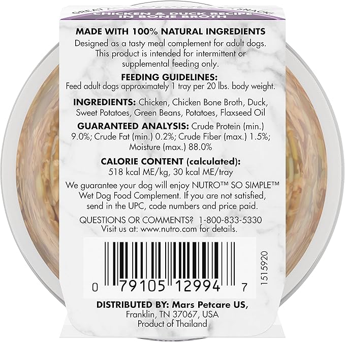 - Contains: Ten (10) 2 oz. tubs of NUTRO So Simple Meal Complement Wet Dog Food Chicken & Duck Recipe in Bone Broth.