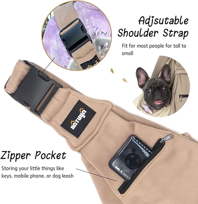 - [Companion]This dog carrier front pack is an ideal solution to keep your pet company in many situations, like bringing your puppy on your errands, taking it to your party, or simply taking a walk after dinner. NATUYA pet sling allows you hand free while you are walking and provides your pet snug and cozy place right next to your body. Enjoy the mama kangaroo moment, both you and your fur kid.