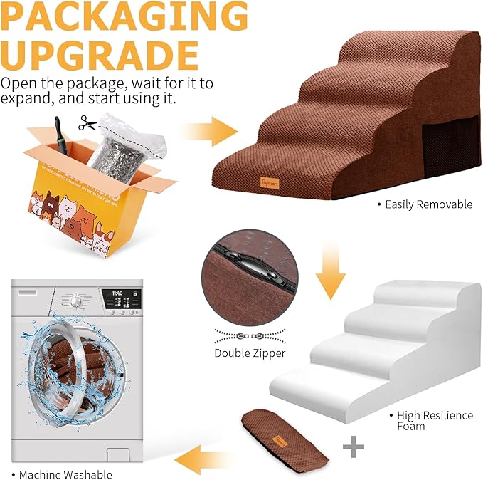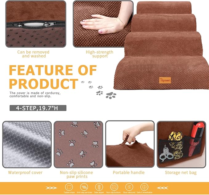 - Safer,Wider&Deeper Steps:Each step is 19.7in x 10.6in. Our dog stairs are excellent for those older dogs who are less mobile as they age or for cats with injuries. More wide and deep steps are helpful for reducing the strain that constantly jumping up and down onto bed,sofa or car can have on your pet's joints,and topmart dog steps will not shake and slip during use. The cover made of corduroy is more frictional than other covers, pets will not slip on the stairs.