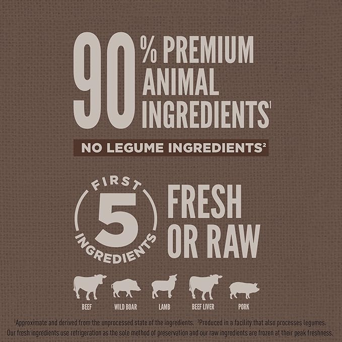 - The first five ingredients are fresh or raw** beef, wild boar, lamb, beef liver and pork for a high protein dog food packed with essential protein, vitamins and minerals to help support digestive health, immune support, and healthy skin & coat