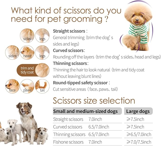 - 🐶[Multipurpose Dog Grooming Shears] FOGOSP curved chunker shears is designed for the trimming,thinning,styling and shaping. It is easy and fast to thinning your pet hair, and it easier to use when styling and shaping towards the end of the groom. They leave a smoother and fluffy outline, and save time versus trying to achieve curves only using straight scissors or curved scissors . It will exceed your expectation to create pretty and sophisticated pet hair style.