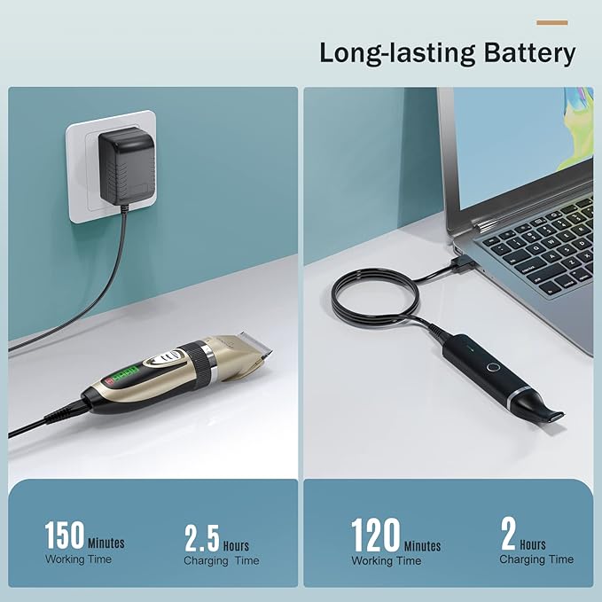 - Cordless Design, Easy to Use: You could use our dog clippers with a cordless status as well as used when charging. With the cordless clipper, you will never be bothered by the trouble of replacing batteries or boring wires anymore. Quite easy to use even for Green hand