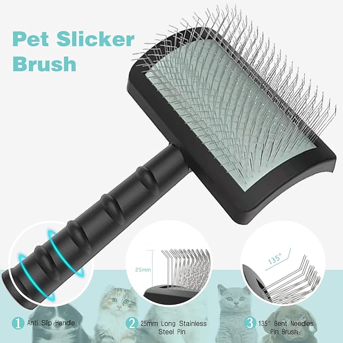 - Slicker Brush - Made for professional groomers,25mm(1'') long stainless steel pin and 135° curved pins brush,which more fit to the contact area of pet hair.Soft stainless-steel pins that gently brush away loose hair, undercoat, mats, and tangles.Designed with larger than standard pins to grasp hair and save time and energy during pet grooming.