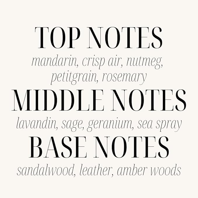 - Top notes: mandarin, nutmeg and rosemary, Middle notes: sage, geranium and sea spray, Base notes: leather, sandalwood and amber woods