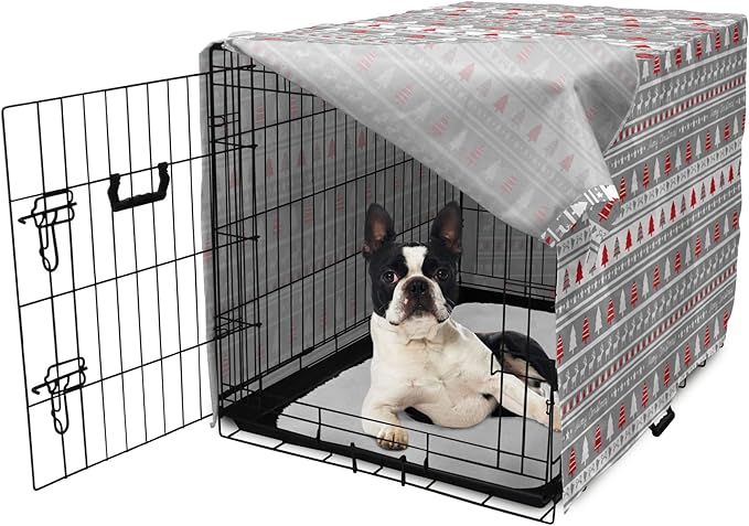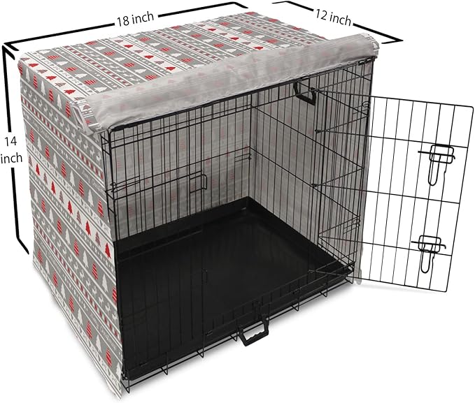Ambesonne Christmas Dog Crate Cover, Xmas Border Deers Trees and Merry Christmas Lettering Bows Bells Image, Easy to Use Pet Kennel Cover for Small Dogs Puppies Kittens, 18 Inch, Grey White and Red
