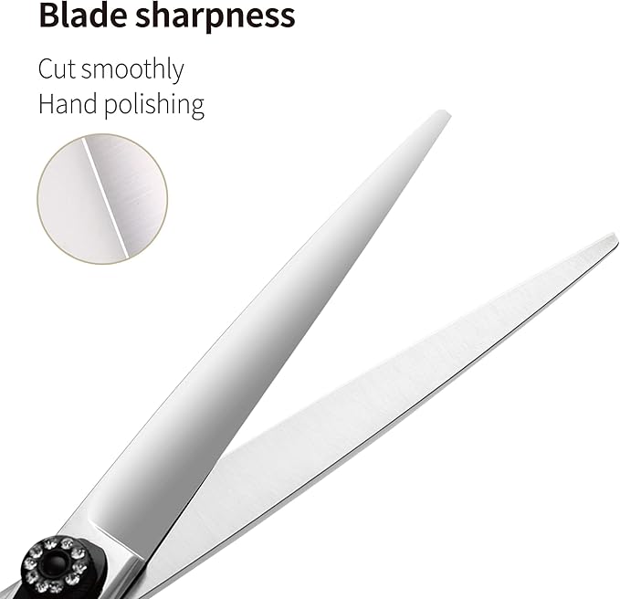 - sharp and Fine Cut - These straight dog grooming scissors are sharpened by handicraftsmen. Experts check the scissors' sharpening one by one. Consequently, the blades of these pet grooming scissors are extremely sharp, and the cut is very fine, precise, and fast, It works very well on any type of coat, regardless of whether it is thick, wiry, or curly.
