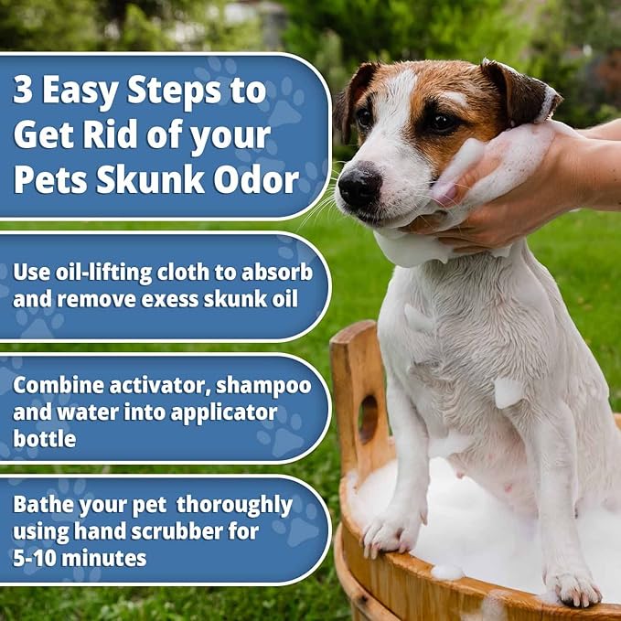 - COMPLETE GROOMING KIT: This all-in-one skunk odor remover for dogs includes pre-measured dog shampoo and activator packet for easy use, along with a hand scrubber for effective cleaning. Oil-absorbing cloth, disposable gloves, and an apron ensure a mess-free experience. Ideal for dog wash or cat grooming, this set also doubles as a pet odor eliminator and includes essential dog bath supplies. A must-have for dog owners and cat bath enthusiasts, suitable for keeping your pets fresh and clean.