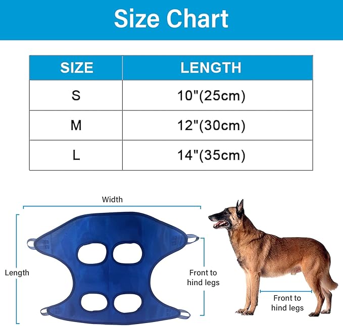 • -In order to get the right size, measure the spacing between your pet’s front legs & rear legs. Leg spacing: Small-5.5 inches/ Medium-6.3 inches/ Large-6.7 inches